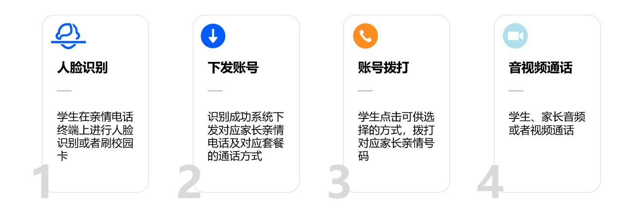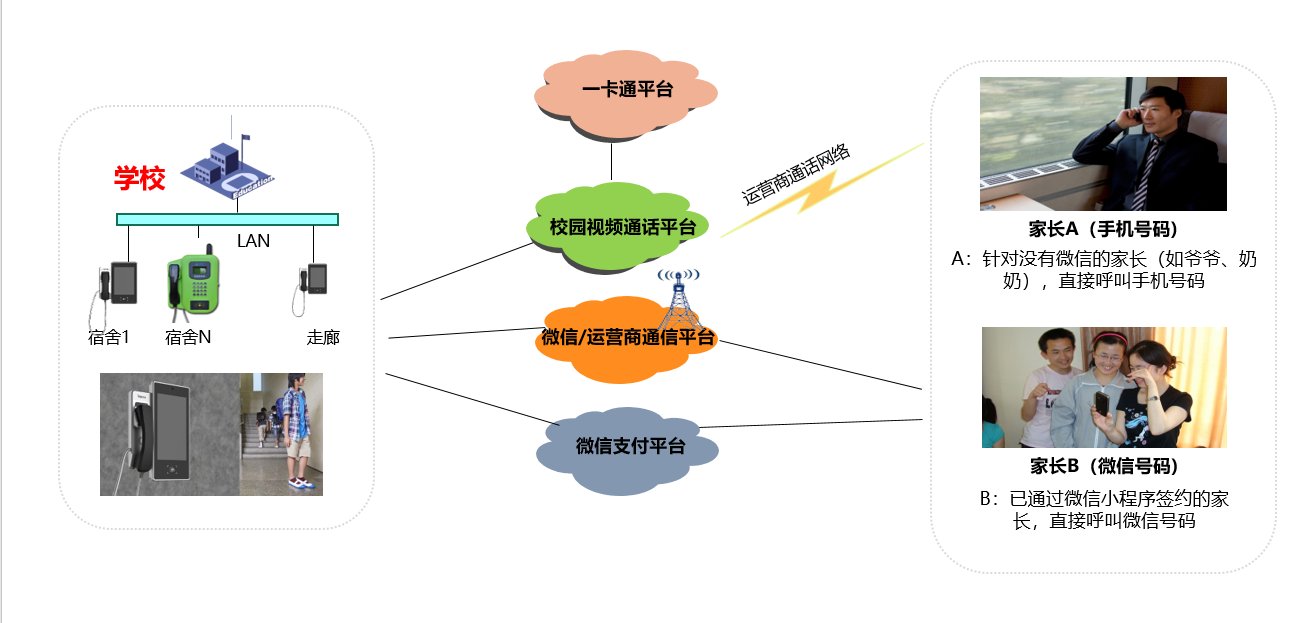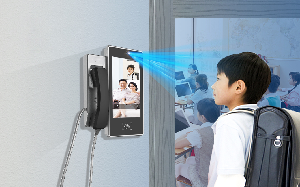 在新的教育政策下,目前中小学学生已不能携带手机或电话手表入校园,为了满足您和孩子的沟通需求。本方案出来支持传统音频亲情电话之外,还通过可视电话为硬件载体,以微信/Volte通信/钉钉平台为学生和家长视频通讯的桥梁,融合人脸识别技术,学生刷脸即可查看亲情号码,呼叫家长的电话或者微信号码,实现刷脸拨打视频电话的新型校园亲情电话方式。
