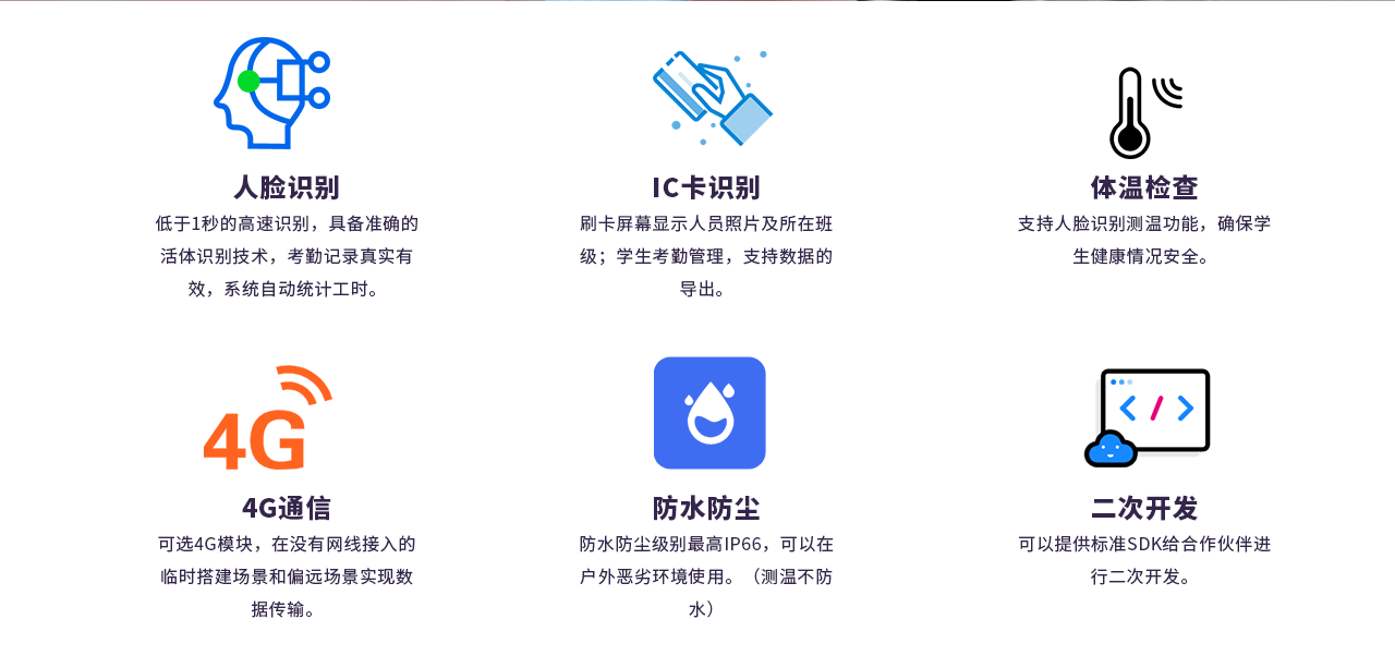 基本功能:学生考勤管理功能,支持数据的导出功能;时间管理,可根据学校的规章制度设置校园的进出时间;卡片权限控制,只限在本校设备上使用和显示内部信息。
